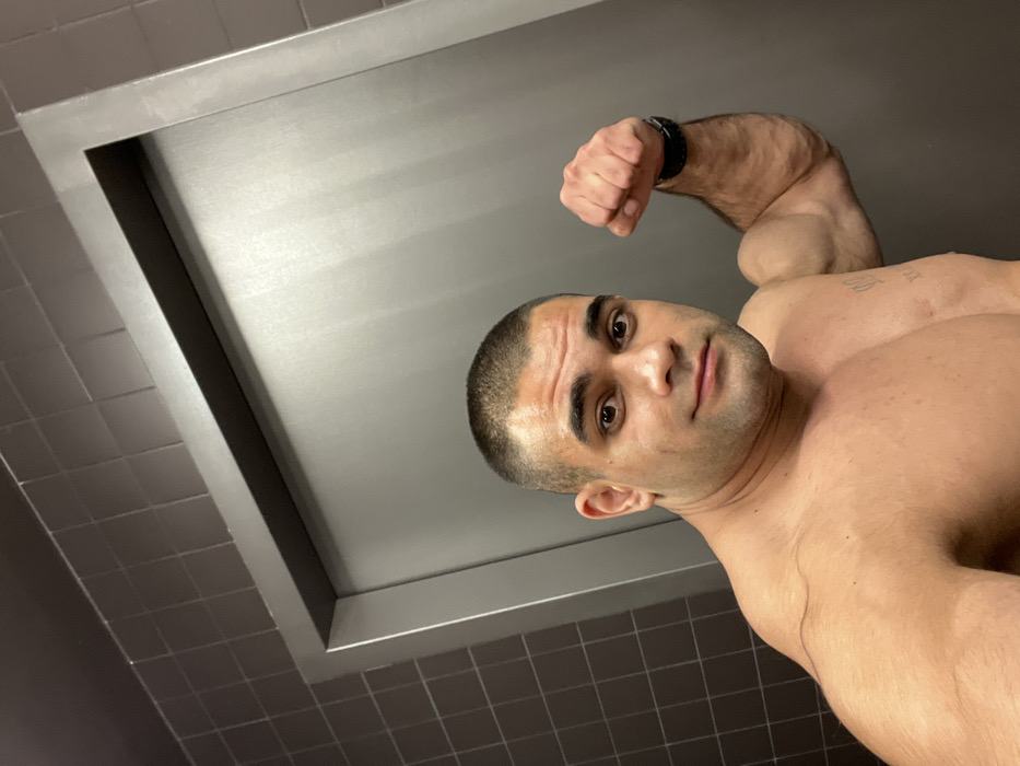 - "An adult male with a muscular physique, dark skin tone, and a short buzz cut haircut is depicted shirtless in an indoor setting" by FM-4IK9y2, licensed under CC BY 4.0