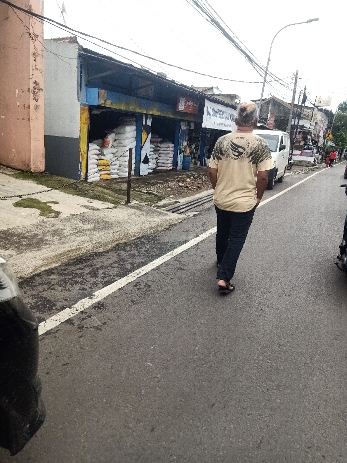 A man in a tan t-shirt and dark pants walks on a road with a white line. He wears sandals. To his left is a store stocked with bags, next to a building with a gray and yellow facade. A white van is parked further down the road, near other shops and a few distant figures. Power lines stretch across the sky. A partial view of a dark vehicle is in the foreground.