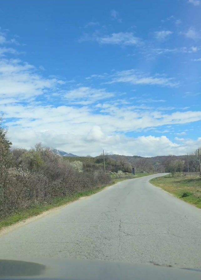 A car is driving down a narrow, cracked asphalt road on a sunny day with a blue sky dotted with fluffy white clouds. Sparse vegetation flanks both sides of the road, giving way to rolling hills in the distance. Power lines are visible along the roadside. The scene is captured from inside the car, with the dashboard visible at the bottom of the frame.