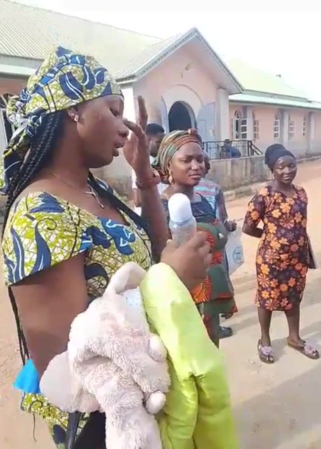 three women standing outdoors in front of a light-colored building that appears to be a church. The woman in the foreground wears a colorful patterned dress and headwrap with long braids. She holds a baby bottle, a stuffed animal, and a green jacket. She is speaking and gesturing with her hands. The second woman, standing slightly behind her, also wears a patterned dress and headwrap and holds a bag. The third woman stands further back and wears a floral-print dress. Other people can be seen in the background near the church entrance. The scene appears to be a sunny day.