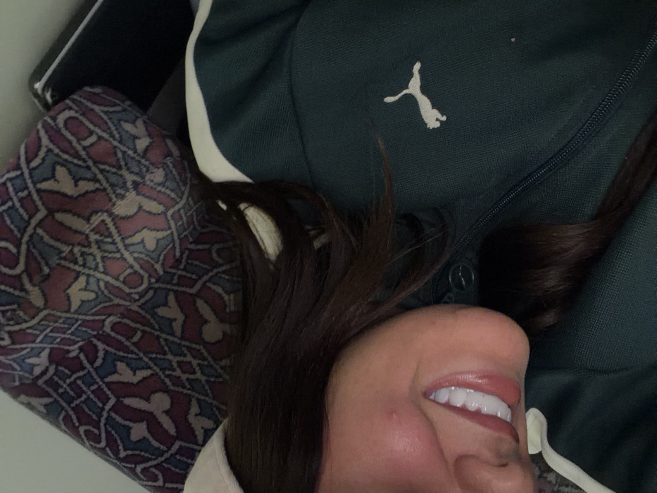 A close-up shot presents a person resting against a patterned cushion, wearing a dark green Puma jacket with a white stripe. Only the side of their face and part of their dark hair are visible. The person is smiling, revealing a set of white teeth. The Puma logo is visible on the upper right side of the jacket. The shot is taken from a slightly elevated angle.