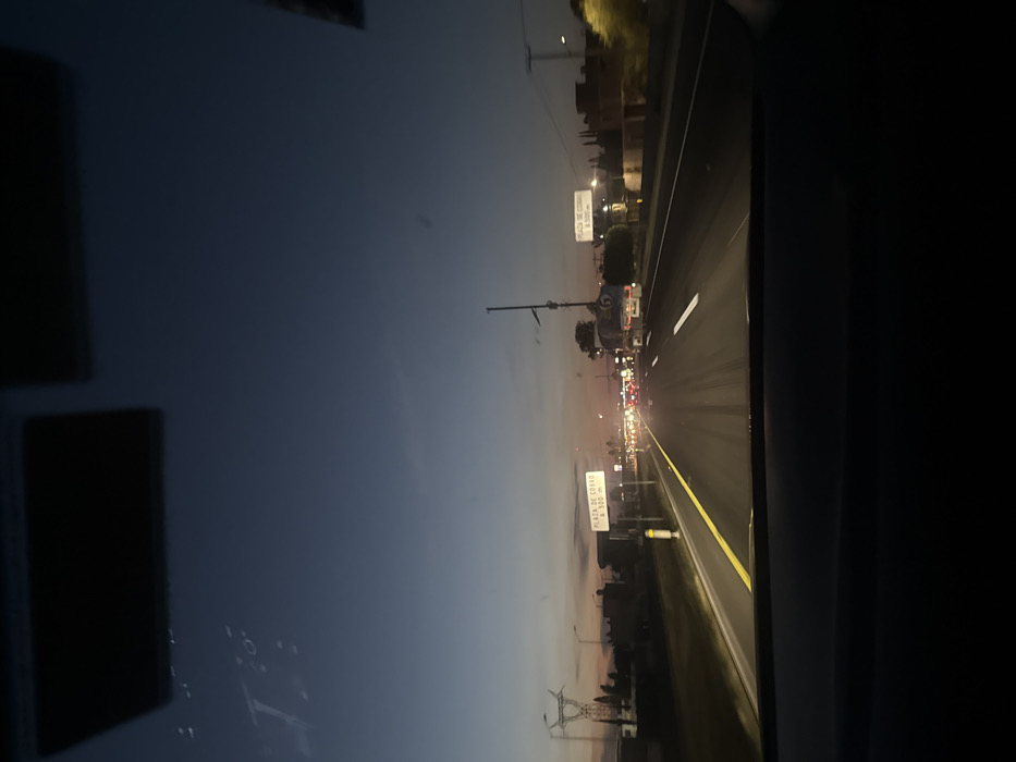 A nighttime highway view from inside a vehicle. The sky is a gradient of dark blue to orange, suggesting dusk or dawn. Multiple light sources are visible, probably from other cars and streetlights. Road signs flank the highway. A yellow line divides the road. The vehicle's interior is visible on the sides, with dark shapes obstructing some view.