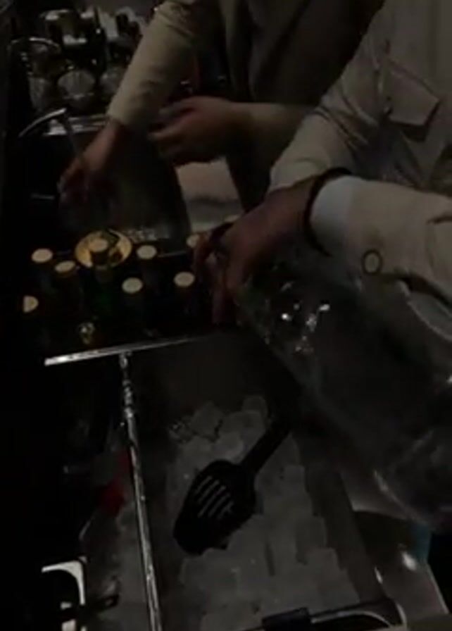 bartender preparing drinks behind a bar. The bar has a stainless steel ice trough filled with ice and a black slotted spoon. Various bottles of liquor are arranged on a shelf above the ice. The bartender is pouring a liquid, likely alcohol, from a clear bottle into a cocktail shaker partially filled with ice. He then places the bottle back on the shelf. In the background, patrons can be seen sitting at the bar, some with drinks already in front of them. There are also additional cocktail glasses on the counter. The bartender and another person assisting are wearing tan jackets.