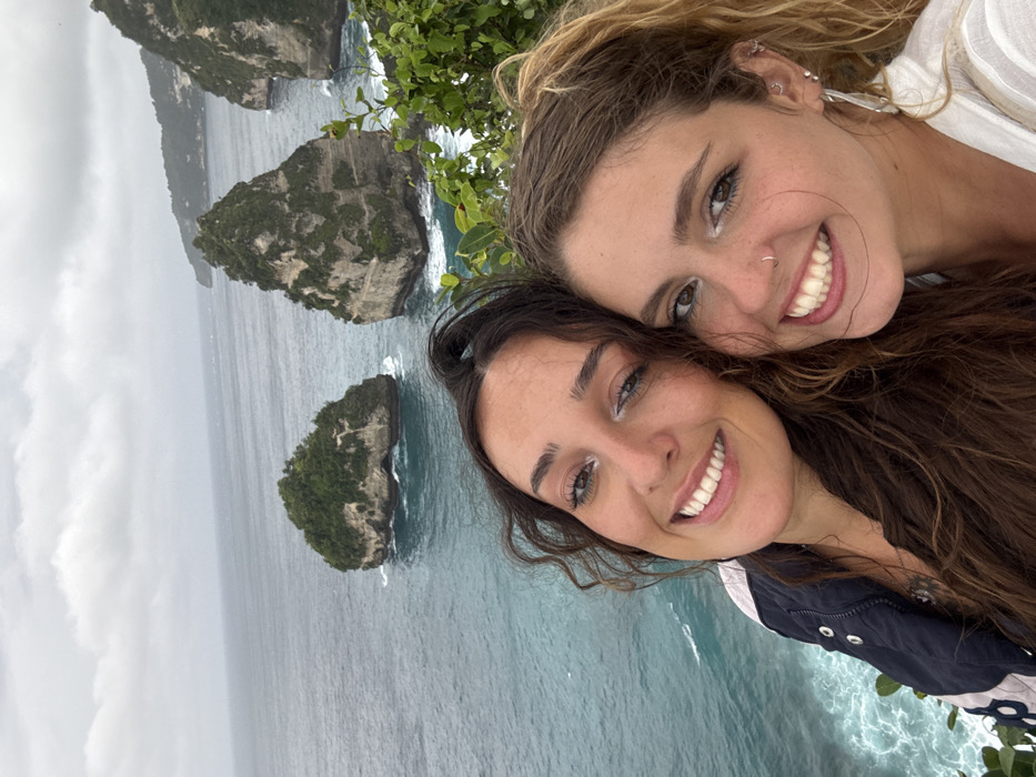 The image depicts two young adult females posing for a close-up selfie-style photograph on an overcast day, overlooking a coastal landscape in Pejukutan, Indonesia