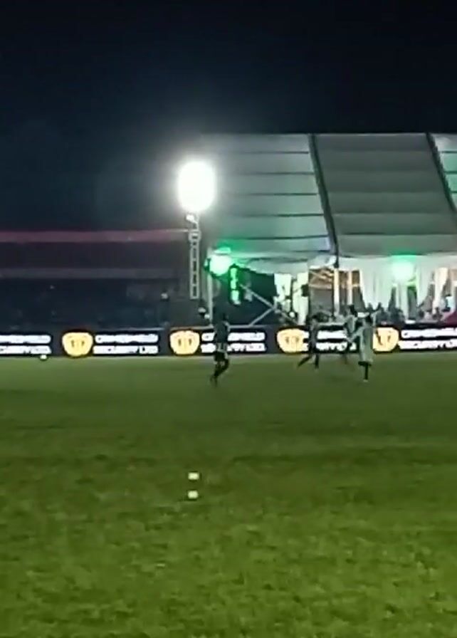 The video depicts a soccer game at night. The field is lit by stadium lights. Several players wearing different colored jerseys are moving around the field. A tent is visible in the background, with lights and people inside. A banner with a logo is positioned behind the field. One player wearing a green jersey with the number 9 on his back is in the foreground. The sound indicates a commentator is talking.