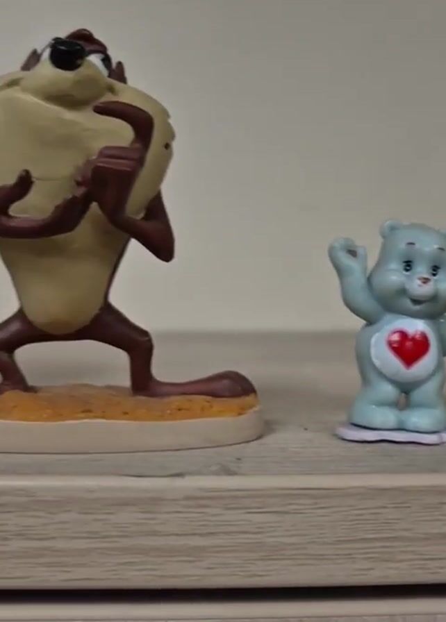 row of small figurines lined up on a light-colored wooden shelf. The figurines include a light blue Care Bear with a red heart on its belly, the Tasmanian Devil, Sylvester the Cat, Wile E. Coyote, Bugs Bunny eating a carrot, and Barney the Dinosaur. The figurines are positioned in front of a beige wall.