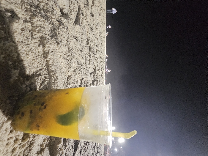 A transparent plastic cup containing a yellow-orange liquid with visible dark seeds and a green citrus slice, along with a bent yellow straw, rests on light-colored sand in the foreground. The scene is set on a beach at night in Rio de Janeiro, Brazil. In the midground, several indistinct human figures are visible, walking or standing on the sand. One figure on the far left wears a light shirt and dark pants, facing away from the viewer. Distant artificial lights from a city or boardwalk illuminate the background against the dark night sky.