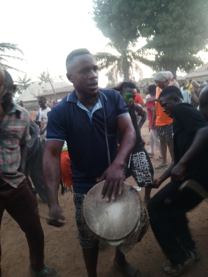 A medium shot captures a man playing a drum in a crowd. He wears a navy polo shirt and patterned shorts, his hands resting on the drum's surface. Surrounding him are various people, one with green paint on his face. The background features trees and glimpses of buildings, suggesting an outdoor gathering or event. The light is soft, indicating it may be morning or evening.