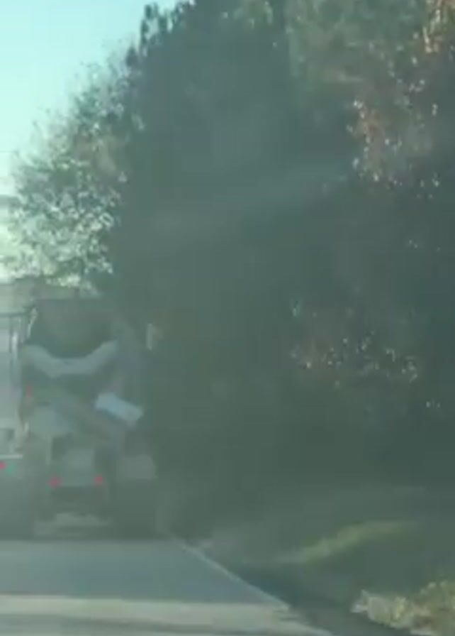 concrete mixer truck driving on a two-lane road. The truck is gray and has a rotating mixing drum on the back. The road is asphalt with yellow lines. On either side of the road are trees and utility poles. The sky is blue and the weather is sunny. The camera is following the truck from behind.