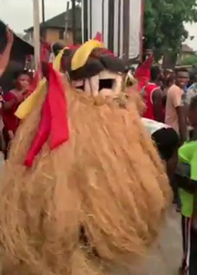 person in an elaborate costume surrounded by a crowd of onlookers. The costume appears to be made of straw-like material covering the entire body, with a dark mask featuring large teeth and colorful accents like red ribbons and a yellow adornment. The person in costume is moving amongst the crowd on what looks like a paved street. The crowd includes people of various ages and genders, and they appear to be watching and some are recording with their phones. The environment includes buildings in the background and a cloudy sky.