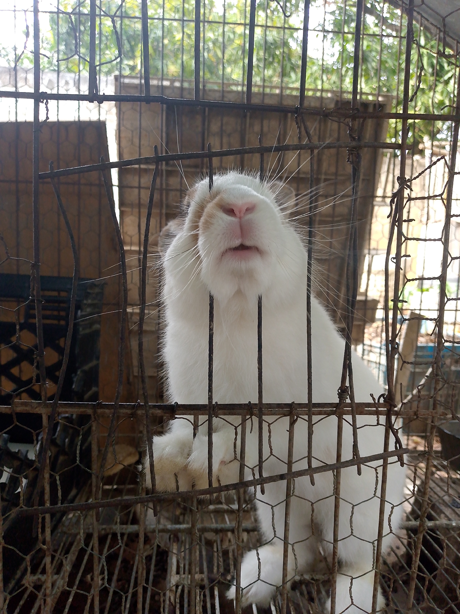 A white rabbit with brown markings around its nose and eyes stands in a rusty, wire cage. The cage is in an outdoor environment with trees and a wall visible in the background. The location is Juan Griego, Venezuela.