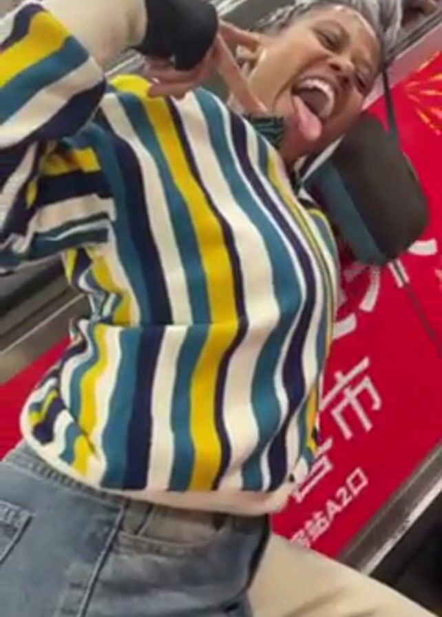 A person with their hair styled in a bun or wrapped stands on an escalator and poses for a video. They wear a striped sweater with blue, yellow, and white stripes, blue jeans, and tan pants. The person sticks their tongue out, makes a peace sign with their fingers, and smiles. The escalator moves upwards, and behind the person is a red sign with Chinese writing. Other people can be seen in the background.