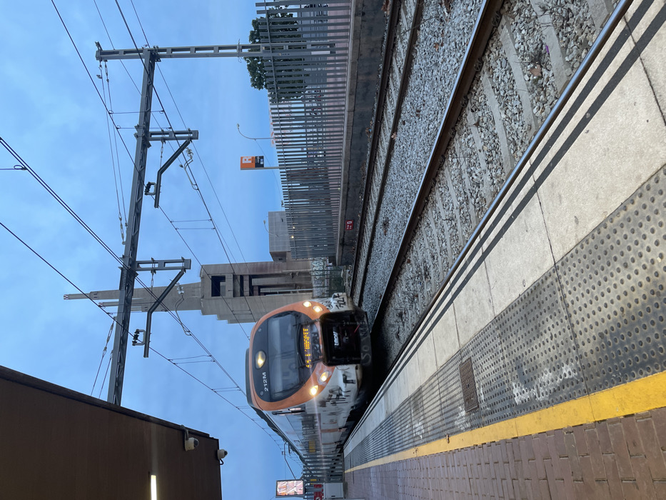 - "A train approaches a station platform, its orange and white exterior marked with some graffiti" by FM-T5EOT2, licensed under CC BY 4.0