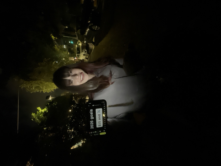 A young woman is standing outside in the dark, holding up a phone. The screen reads "2026 goals" and "$$$ and X". A street or parking lot with cars and foliage in the background is visible, though the surrounding area is dark. The woman is smiling and wearing a hooded sweatshirt.