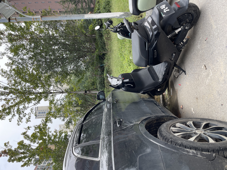 The image displays an outdoor urban scene in Zhongyuan District, China, under an overcast sky. A dark-colored SUV, appearing black or dark grey, occupies the left side of the frame, parked on a paved surface. Its rear driver-side wheel, door, and quarter panel are visible. Directly adjacent to the SUV's rear driver-side door, a black electric scooter is parked on its kickstand, positioned in extremely close proximity to the vehicle's side. The scooter features a white digital display and a rear mudguard bearing the Chinese characters '九号' (No. 9). A portion of a second, light green electric scooter is partially visible behind the black one. The immediate background consists of lush green vegetation, including overgrown grass, bushes, and several tall deciduous trees. In the distance, multiple high-rise residential buildings are partially discernible through the foliage. A utility pole is visible on the far right edge of the frame.