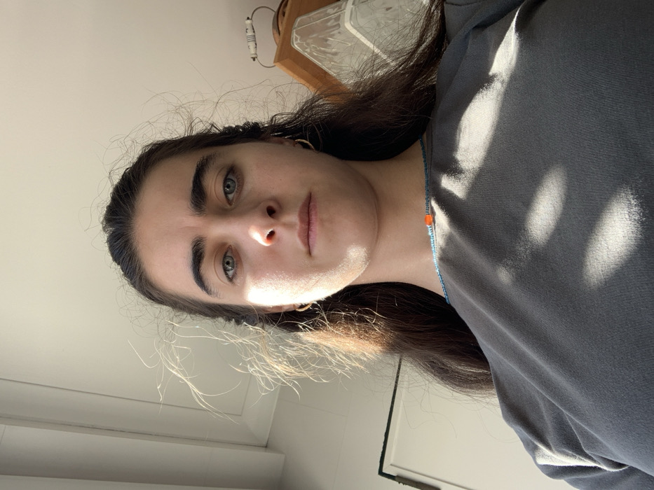 A young adult female is depicted in a medium close-up, photographed from a low angle in an indoor setting in Lisbon, Portugal