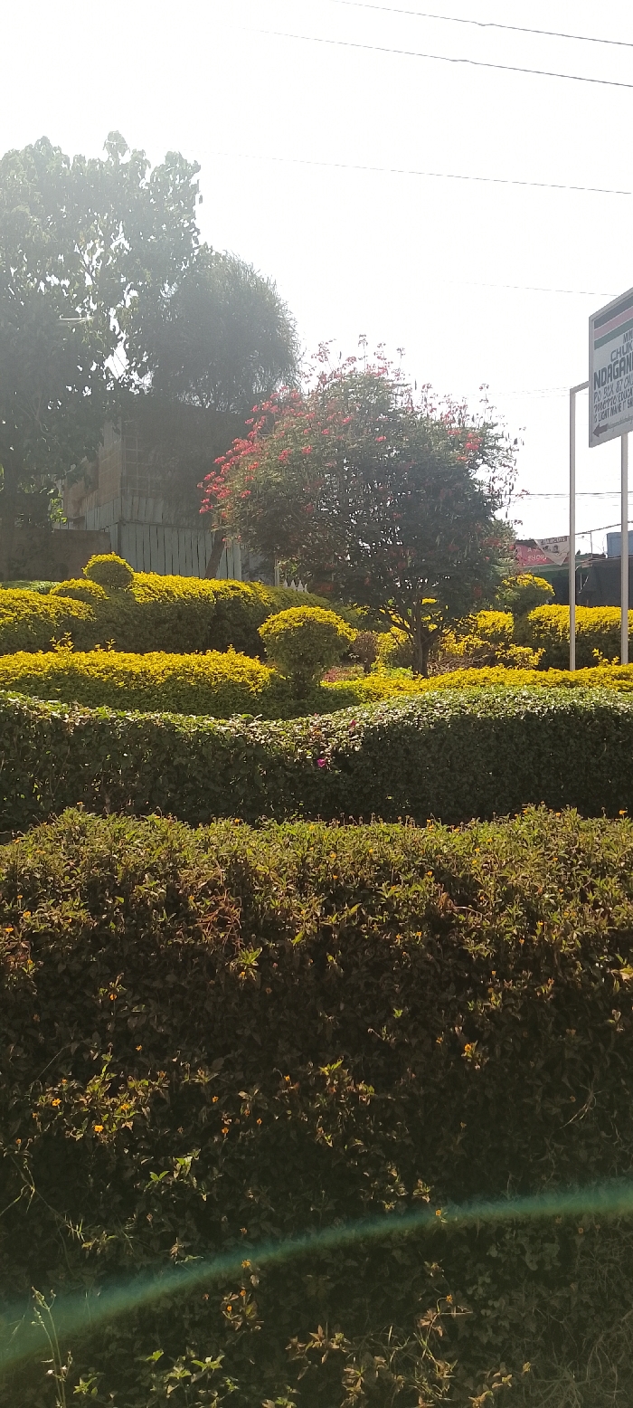 The image displays a static outdoor scene, identified as Karingani ward, Kenya, near Ndagani, based on a visible sign. The foreground features multiple tiers of manicured hedges, predominantly dark green with sections of brighter yellowish-green foliage and interspersed small yellow and purple flowers. A horizontal blue-green lens flare is present in the lower frame. In the midground, a sizable tree with dark green leaves and numerous red/pink flowers stands centrally, surrounded by additional shaped green hedges. Behind the vegetation, on the left, a light-colored structure, possibly corrugated metal, is partially visible. The background consists of more dense green trees against a bright, hazy or overcast sky, with overhead power lines traversing the upper portion. A white-framed signpost on the right displays "MINISTRY OF EDUCATION," "CHUKA / CHOGORIA SUB-COUNTY," "NDAGANI," postal details (P.O. BOX 87 CHUKA, 90200 CHUKA), and "NDAGANI WARD" or "NDAGANI LIGHT." No individuals or active interactions are depicted.