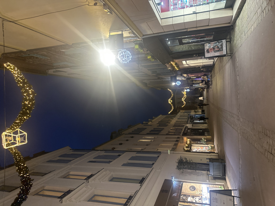 A street is adorned with festive Christmas lights. Tall buildings line both sides, and lights stretch across the street. People can be seen walking in the distance. The sky is a dark blue, and the light fixtures illuminate the scene. Shop signs are visible along the storefronts. The street appears to be paved with cobblestones or a similar material.