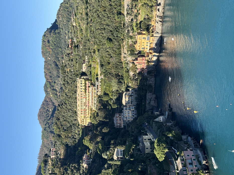 This image depicts a panoramic view of Portofino, Italy, a coastal town situated on the Ligurian Sea. The scene is dominated by a clear, bright blue sky above steep, heavily vegetated hillsides that descend towards a calm, deep blue cove. **Environment:** The upper two-thirds of the image showcase lush green hills covered extensively with trees, shrubs, and visible terraced sections, likely olive groves. The lower third features the tranquil, blue waters of the Ligurian Sea, reflecting the sky and surrounding landscape. Rocky outcrops form the coastline, upon which structures are built. Sunlight illuminates the scene from the left, casting distinct shadows on the right sides of buildings and parts of the water. **Structures and Objects:** * **Hillsides:** Numerous multi-story buildings and villas are integrated into the verdant slopes. Prominently, near the upper-center, a large, light-yellow, multi-winged building with red-orange window accents stands, indicative of a hotel or grand estate. Other residential structures, varying in size and color (pink, cream, light yellow), are interspersed throughout the foliage, connected by winding roads or paths. * **Waterfront:** At the water's edge, a cluster of colorful, traditional Ligurian buildings, primarily in shades of yellow, terracotta, and light orange, are constructed directly onto the rocky shoreline. Some of these feature arched bases or retaining walls. * **Cove:** A small, white, conical-roofed structure, possibly a watchtower or decorative element, is visible on a rocky promontory jutting into the cove on the left side. * **Watercraft/Buoys:** Several small boats are present in the water; a white sailboat is moored in the lower-left. A line of multiple yellow cylindrical buoys extends across the central-left area of the cove, marking an unseen boundary or path. White, less distinct objects, possibly buoys or small debris, are scattered in the water closer to the right side of the cove. **People, Actions, Interactions:** No individuals are visible within the frame. No specific actions or interactions are depicted. The scene is devoid of human activity, presenting a serene, static coastal landscape.