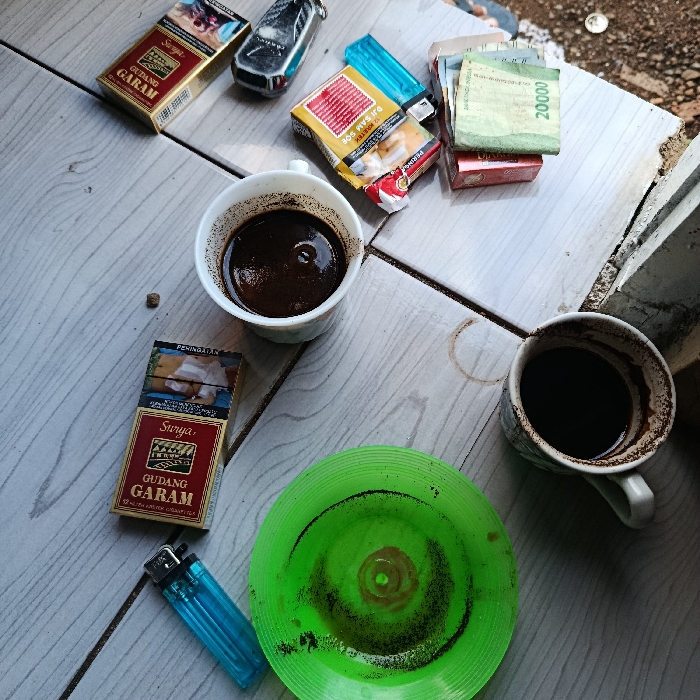 An aerial shot displays a flat surface of white and gray tiles. Objects include two full cups of coffee, a green plastic plate with coffee grounds, two packs of 'Gudang Garam' cigarettes, a pack of 'Dji Sam Soe' cigarettes, a blue lighter, a toy car, and a stack of green 20,000 Indonesian Rupiah banknotes. The items are arranged casually on the tiled surface.