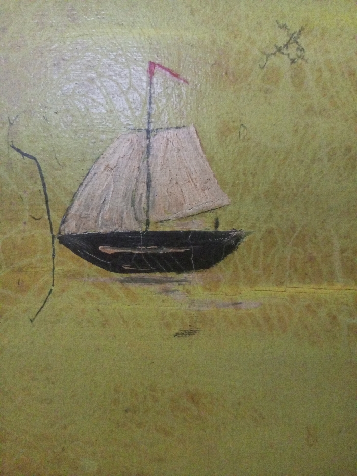 A two-dimensional artwork on a textured, light greenish-yellow substrate depicts a sailboat in the city of Zee Pin Kone, Myanmar