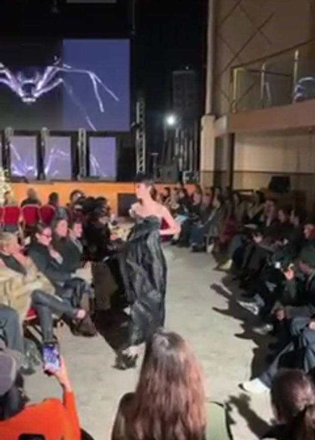fashion show in an indoor space. A model walks down a central aisle between seated guests on either side. She is wearing a dark, shiny strapless dress. A large screen at the end of the aisle displays a digital image that resembles a spider. Attendees are seated and many are holding up their phones, presumably to take photos or video of the model. The space appears to be a theater or auditorium, with high ceilings, beams, and additional balconies visible. The lighting is dim but focused on the runway.