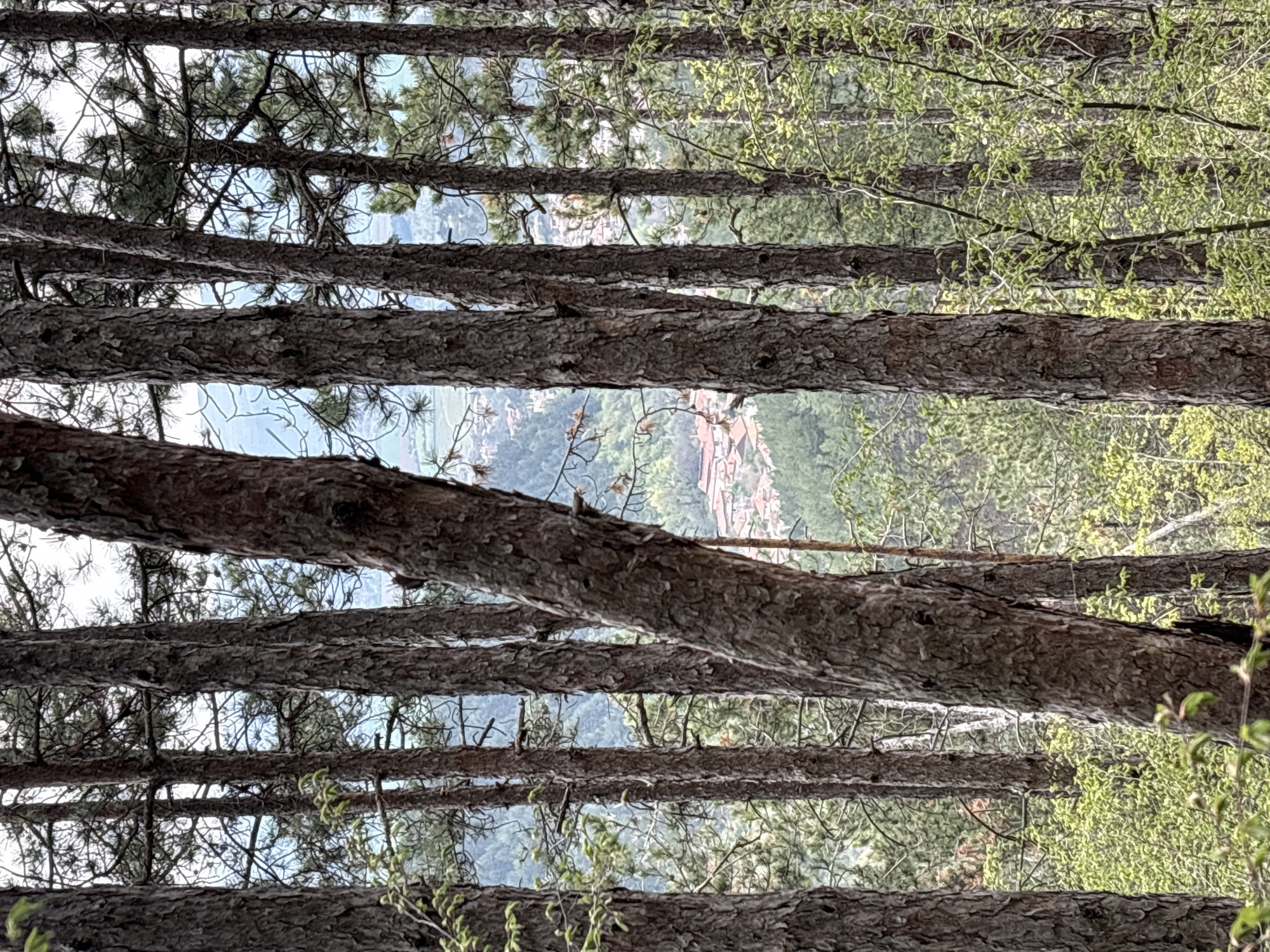The image depicts a view upwards through a forest of pine trees. The viewer appears to be located in a pine forest overlooking the city of Maglizh, Bulgaria. The foreground is dominated by the trunks of the pine trees. The spaces between the trunks offer a view of the town below, with buildings visible among the foliage. The sky is visible through the upper branches of the trees. The lighting suggests it is daytime. The foliage on the right appears to be younger trees, with their fresh green leaves.