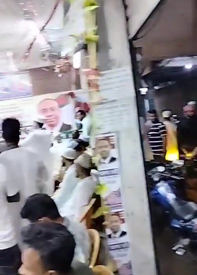 The video begins outside on a street, capturing motorcycles parked along the roadside with pedestrians passing by. It quickly transitions to an indoor setting, likely a meeting room. Numerous men are seated in chairs, with a few standing or moving around. The room is decorated with posters and banners bearing images of individuals, possibly political or community figures. The atmosphere suggests a gathering or meeting in progress.