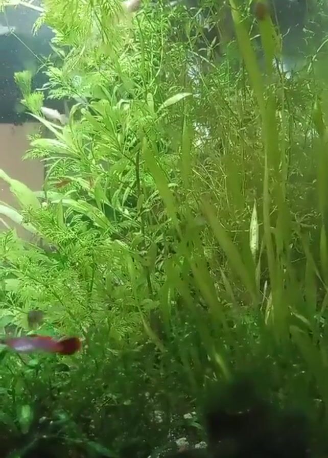 n aquarium filled with lush, green aquatic plants. Small fish, predominantly red and silver, are swimming among the plants. The lighting is bright, illuminating the underwater environment. The camera angle is low, looking upwards towards the surface of the water.