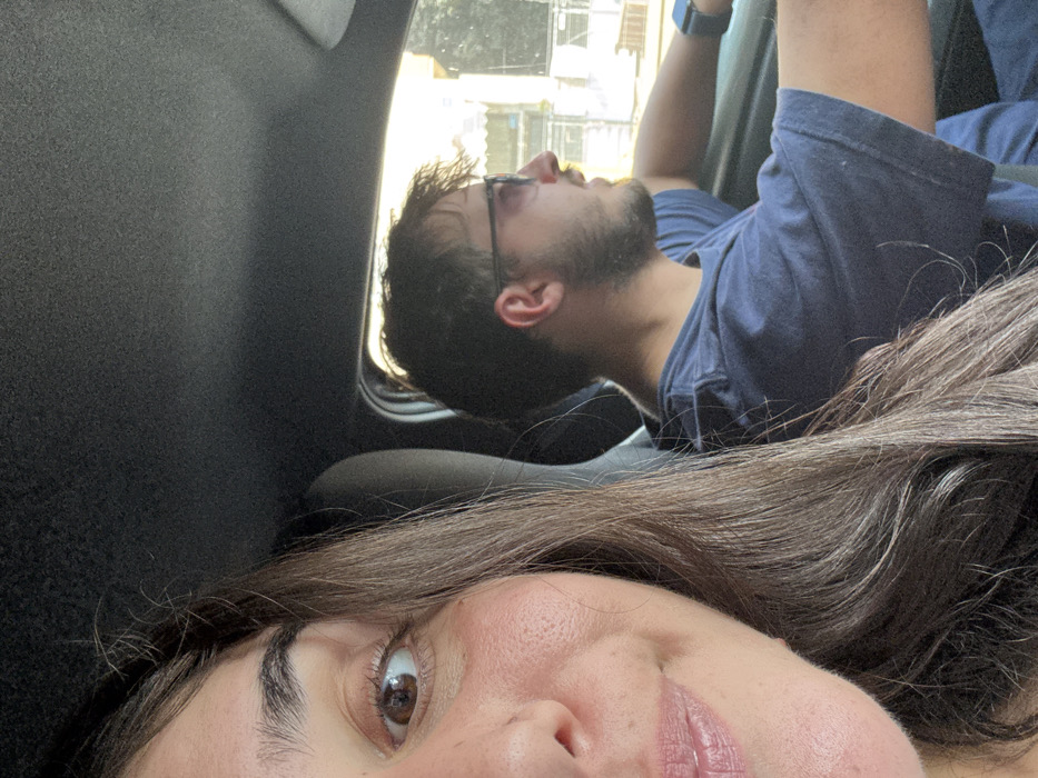 The image depicts the interior of a vehicle during daylight hours, featuring two individuals