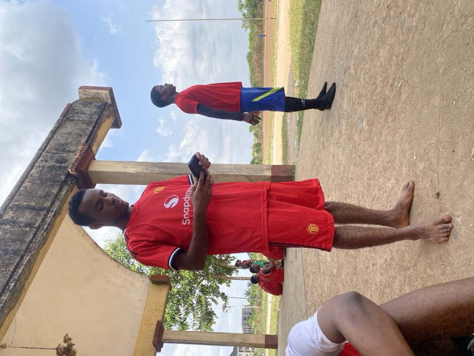 An outdoor scene in Ihiagwa, Nigeria, depicts several male individuals on a concrete surface adjacent to a dirt and grass field under a partially cloudy sky. In the foreground, slightly left of center, a young male with dark skin and short dark hair stands barefoot, facing forward and looking down at a black smartphone held in both hands. He wears a red short-sleeved Manchester United soccer jersey with a "Snapdragon" sponsor logo and matching red shorts with a Manchester United emblem. His legs are visible and appear hairy. To his right, another young male with dark skin and short dark hair stands in profile, facing right, also wearing a red short-sleeved shirt, blue shorts, and black calf-length socks. His arms are at his sides, and he appears to be observing the field. Partially visible in the lower left foreground is the arm and leg of a third individual, seated on the concrete surface. In the mid-ground, under a concrete canopy supported by two visible pillars, a group of approximately three to four other males, predominantly wearing red attire, are seated or partially visible. Further in the background, to the right, is a large, open dirt field with patches of grass, indicative of a sports ground. A white pole, possibly a goalpost, stands vertically in the mid-ground of the field. Distant foliage and blurred residential buildings are visible on the horizon to the left. The overall lighting suggests daylight.