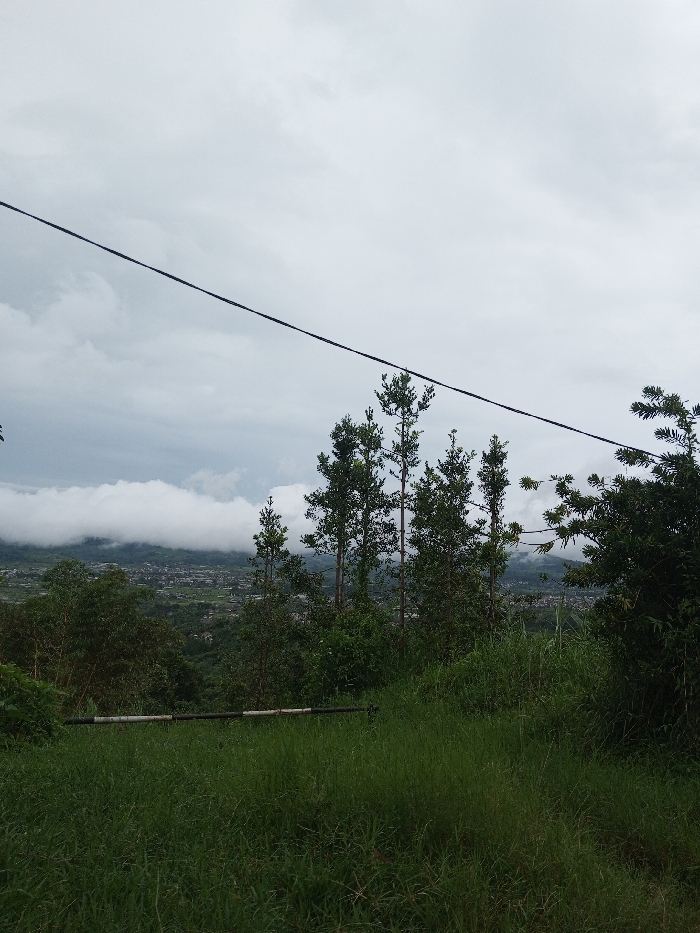 The image depicts an elevated outdoor scene in Ambakirano, Madagascar, under an overcast sky. The foreground is dominated by unkempt, verdant green grass. In the lower-left to mid-left, a horizontal black and white striped barrier or pole is visible, partially obscured by the grass. The midground features several tall, slender coniferous or evergreen trees with dark green foliage, interspersed with other dense green bushes and trees. A thin black electrical or communication line traverses the frame diagonally from the upper-left towards the upper-right. In the background, a sprawling urban or semi-urban settlement with numerous structures is visible in a valley, flanked by rolling hills and mountains. A significant bank of white clouds or fog rests low in the valley, partially obscuring the distant landscape and mountain peaks. No individuals or animals are present in the scene, and no specific actions or interactions are occurring.