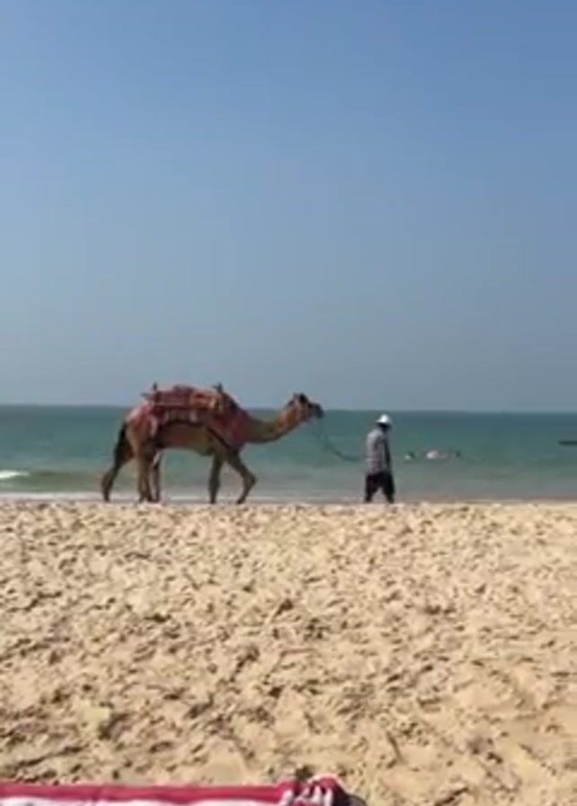 A serene beach scene unfolds under a clear, blue sky. In the foreground, a red and white striped towel lies on the sandy ground. A camel adorned with a decorative pink saddle blanket and bridle stands near the water's edge. A man in a white hat and checkered shirt walks alongside it, holding the camel's lead rope. In the distance, several people are swimming in the ocean. A small, wheeled cart sits on the beach to the right of the man and camel.