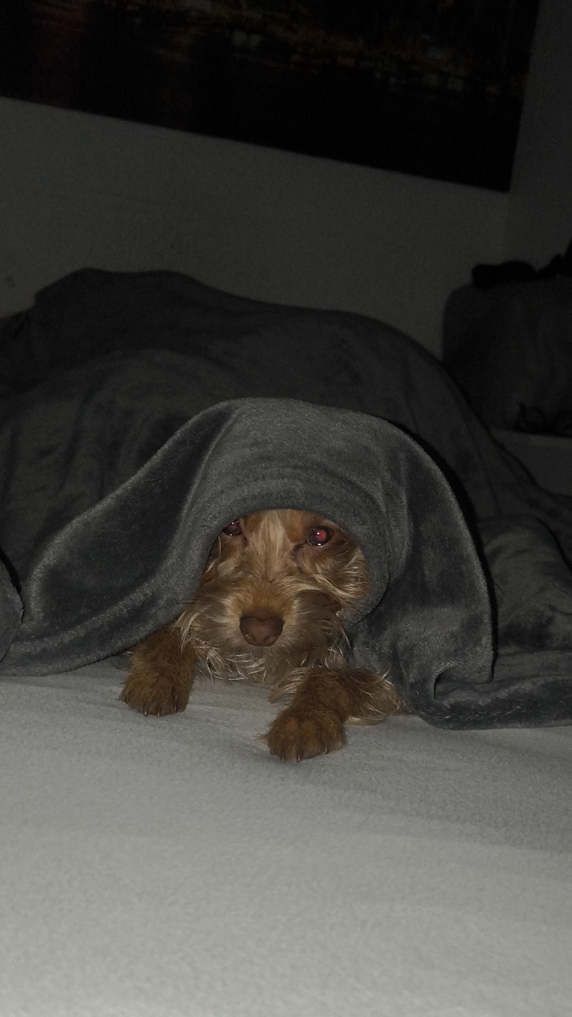 An indoor scene in Ripollet, Spain, depicts a small, light brown dog partially concealed by a gray fleece blanket. The dog's head, with shaggy light brown fur and distinct red-eye effect in its dark eyes, is visible, looking directly forward. Its brown nose is prominent. Two front paws, also covered in light brown fur, rest on a light gray, textured surface, possibly a bed or mattress. The gray blanket is draped over the dog's body and partially over its head, creating a hood-like effect. The background is dimly lit, revealing a light-colored wall and the lower portion of a dark-framed artwork or photograph with warm-toned highlights, positioned horizontally in the upper left quadrant of the image.