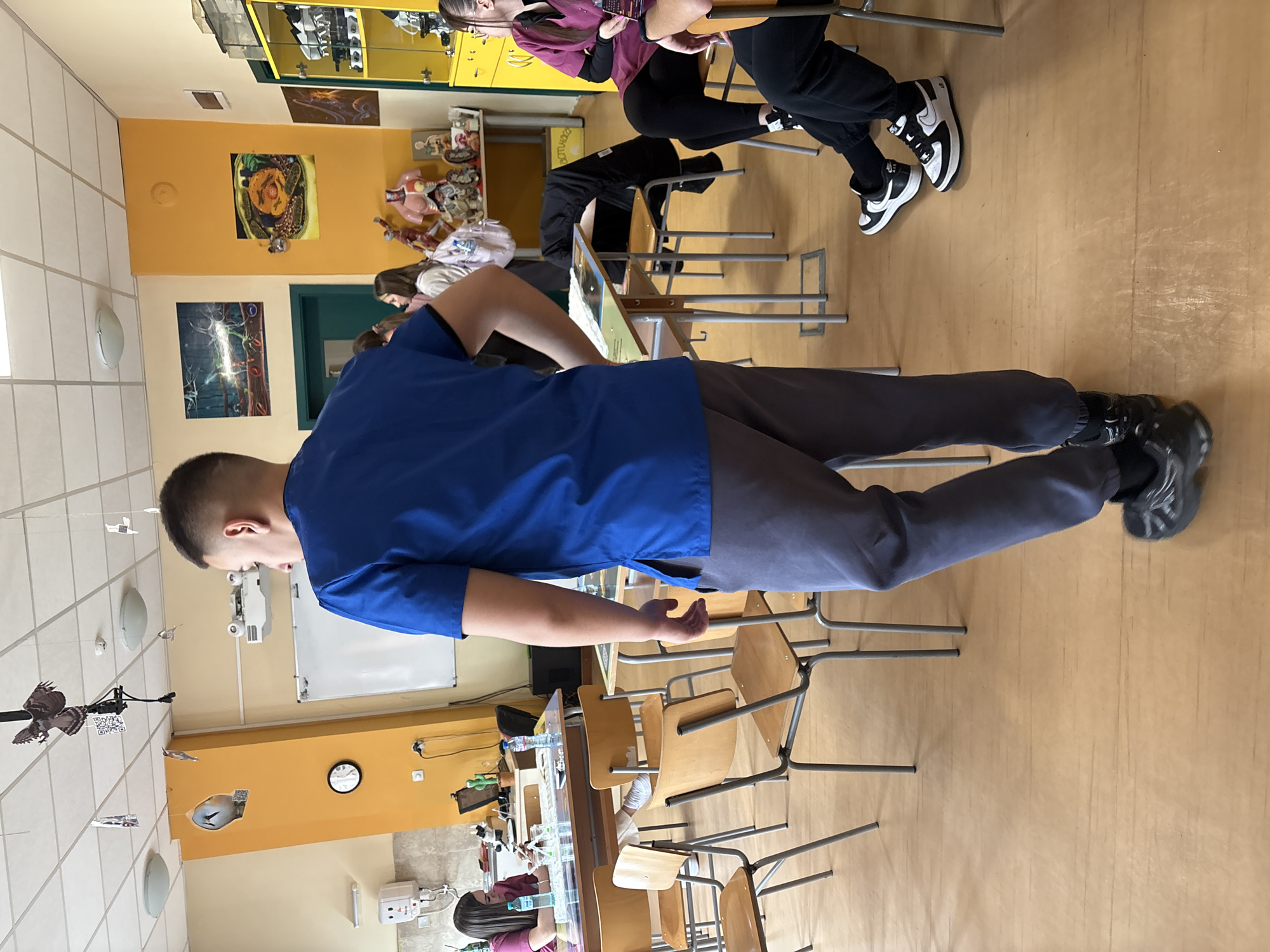 A classroom in Panagyurishte, Bulgaria is populated with students and furniture. A young man in a blue shirt and gray pants stands in the foreground. Other students are seated at desks and chairs, some of whom are wearing pink and black clothing. Classroom decorations, including scientific posters and models, are affixed to yellow walls. A whiteboard is present near the front of the room.