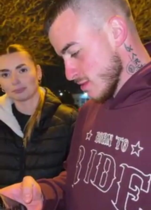A young man with a short haircut and a beard is looking at his phone while standing outside at night. He is wearing a maroon hoodie with a star and the words "Born To Ride" on it. He looks up at the camera and sticks his tongue out. A woman with long brown hair and a black puffer jacket stands to his left, looking at him. Streetlights and trees are visible in the background.
