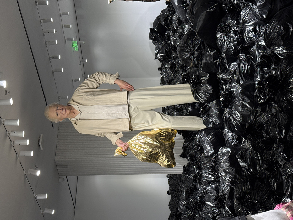 The image depicts an indoor art installation at the UCCA Edge in Shanghai, China. A hyperrealistic, life-sized sculpture of an elderly man stands centrally atop a vast, uneven mound of numerous tied-off black plastic trash bags that cover the entire floor. The man has white, thinning hair, a wrinkled face, and a neutral expression. He is dressed in a light beige, long-sleeved collared shirt, open over a lighter beige button-up shirt, and matching pleated trousers. In his left hand, he holds a crinkled, shiny gold-colored bag, while his right hand rests on his hip. The background consists of plain white walls, a fluted light gray pillar to the left, and a white ceiling fitted with multiple track lights. A green illuminated exit sign with Chinese characters is visible on the far right wall near the ceiling. A viewer's shoe and lower leg are partially visible in the bottom-left corner.