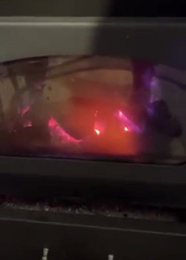 close-up of a burning fire inside a black wood-burning stove
