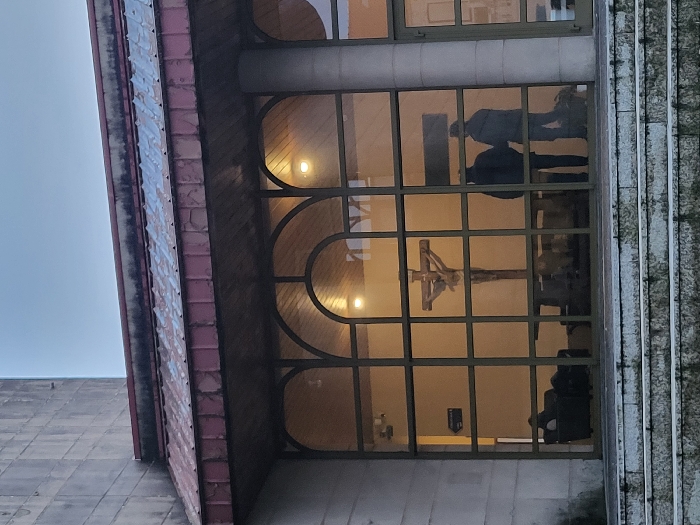 A church exterior featuring a large window with metal framework is depicted. Inside, a crucifix is visible. Two figures are reflected in the glass. A tiled roof is shown on the left and a set of stairs on the right. The lighting is warm inside the church, contrasting with the overcast sky.
