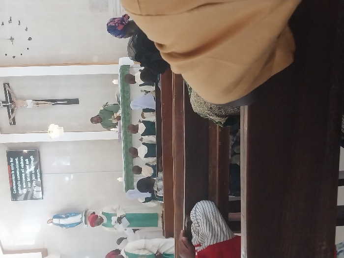 The image depicts the interior of a Catholic church in Bauchi, Nigeria, during a religious service