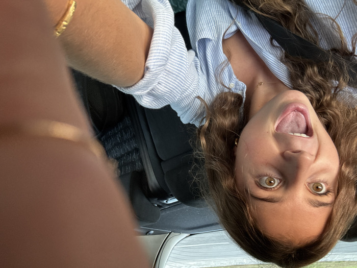 A female individual is captured in a close-up selfie within a vehicle, likely in the city of Oeiras, Portugal. She is positioned in a passenger seat, secured by a black seatbelt. Her head and upper torso dominate the left and center of the frame. She possesses shoulder-length wavy brown hair, light brown eyes opened wide, and her mouth is agape, revealing her tongue in an expression indicative of surprise or intense excitement. She wears a light blue and white striped button-down shirt, a thin gold-colored necklace with a small pendant, and small gold hoop earrings. Her right arm and hand are extended towards the camera, with blurred fingers partially obscuring the upper right corner of the image. A gold-colored bracelet is visible on her right wrist. The background, largely out of focus, shows the black headrests of the vehicle's front seats and a blurred exterior view through a window, suggesting a road or highway environment and vehicle motion under daylight conditions.