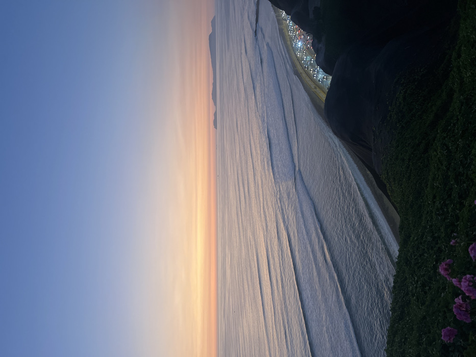 An elevated view of a beachside landscape is presented. The sky transitions from blue to orange, casting a golden glow on the calm water. Distinct wave patterns are visible as the water meets the shore. On the right, lush greenery including a few violet flowers contrasts with the darker land formations. A road crowded with vehicle lights snakes alongside the shore, indicating human activity. The scene captures the transition from day to night.
