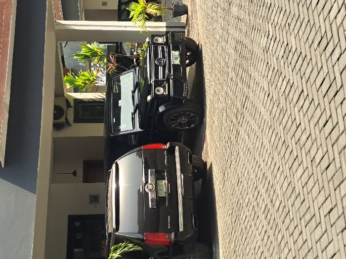This image depicts a residential or commercial complex in Igboefon, Nigeria, under daylight conditions. Two black luxury SUVs are parked on a grey interlocking brick driveway. On the left, a black Cadillac Escalade, model "PLATINUM," is seen from the rear, displaying a Nigerian license plate "DEMO YZA." To its right, a black Mercedes-Benz G-Class (G-Wagen) is parked, facing forward, with a customized front bumper and a Nigerian license plate "AYI." The vehicles are positioned in front of a modern, light-colored building with a large overhang or carport. Architectural features include dark-framed windows and doors, a prominent outdoor air conditioning unit mounted on the wall to the right, and a hanging light fixture under the overhang. A white sign with the designation "B6" is affixed to the building's facade. Several small, potted palm-like plants are arranged around the perimeter of the building and driveway. No individuals are present in the scene.