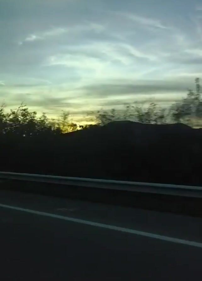view from a moving vehicle, likely a car, driving on a road. The road has a white line marking the lanes. A guardrail is visible on the side of the road. Beyond the guardrail, there's vegetation, primarily trees, silhouetted against the sky. The sky is a mix of light blue and yellow, indicating either sunrise or sunset. The camera angle is from inside the vehicle, looking out the side window. The reflection of the side mirror is slightly visible. The overall impression is of a drive through a rural or semi-rural area during dawn or dusk.