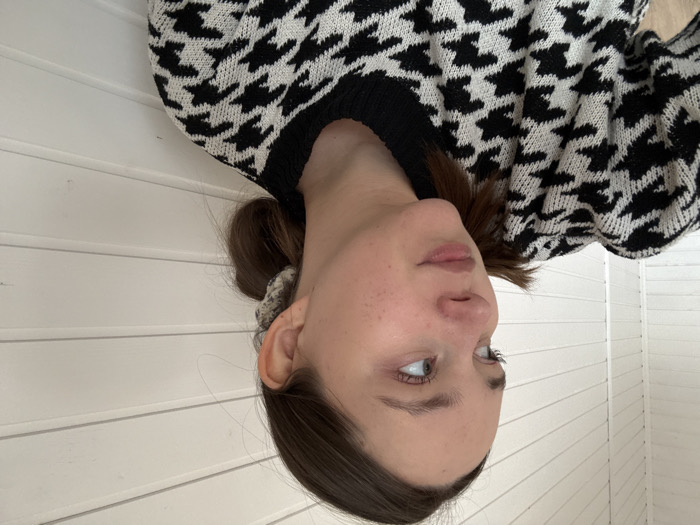 A female individual is depicted in a medium close-up, facing towards the left of the frame with her head turned to her left. Her light brown hair is pulled back into a low bun, secured by a light-colored, patterned scrunchie visible behind her right ear. She has fair skin, with visible freckling and a slight redness on the bridge of her nose. Her left eye, light in color, is directed towards the left. She is wearing a black and white houndstooth patterned knitted sweater with a black ribbed collar. The background consists of a wall of white horizontal wooden planks, indicating an indoor or sheltered outdoor setting. The scene is located in the city of Starokorsunskaya, Russia. No other individuals or objects are present within the frame.