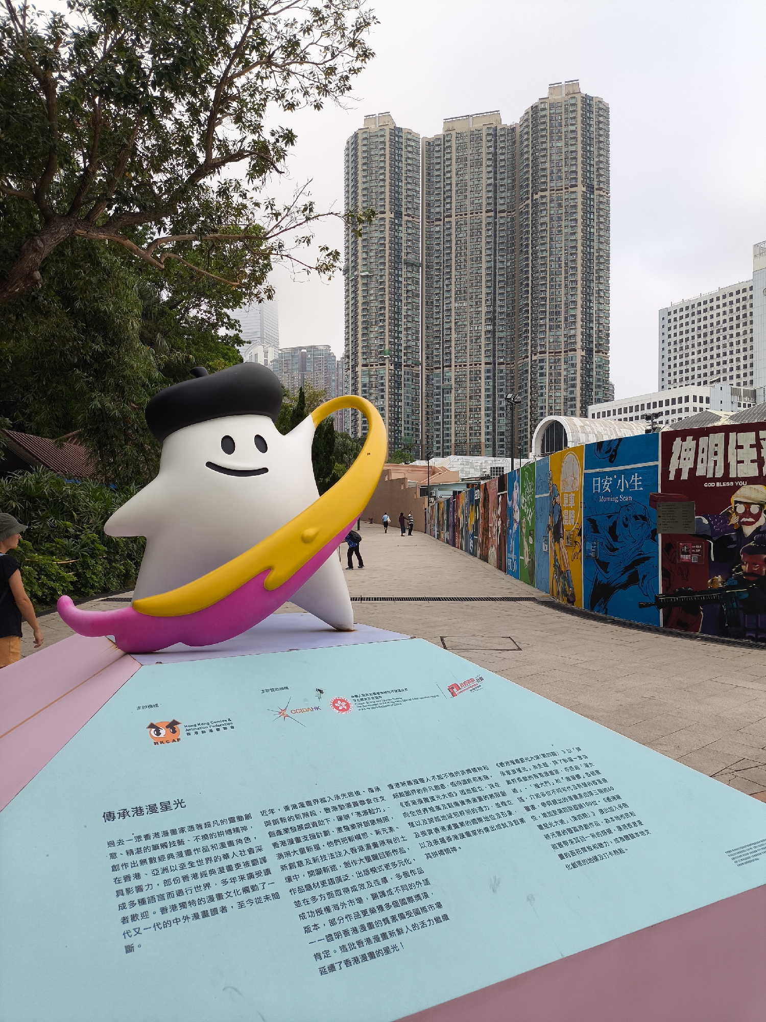 A photo taken in Hong Kong shows a cartoonish, white, star-shaped sculpture with a black beret and a crescent-shaped, yellow and pink object. The sculpture is placed on a pink platform with Chinese text. In the background are tall residential buildings, a mural wall featuring comic-style art, and some people walking. The environment suggests an outdoor exhibition or art installation in a public space within the city.
