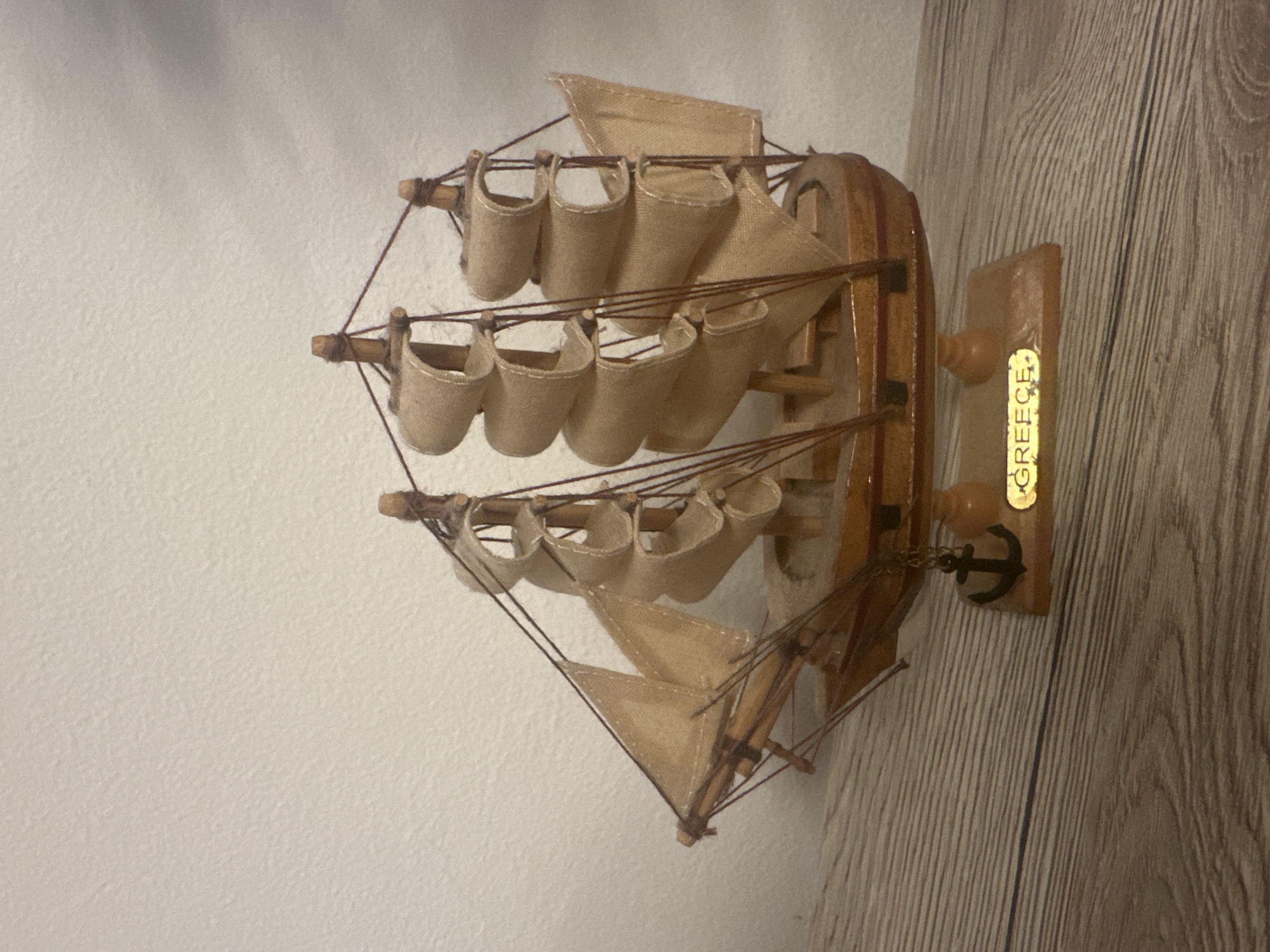 A wooden model of a sailing ship is mounted to a wall. The sails are a light tan color. The ship's nameplate is gold and reads "GREECE." An anchor hangs from the stern. The ship is mounted to a light-colored wall on the left and a light-colored wood paneled wall on the right. The location is unknown.