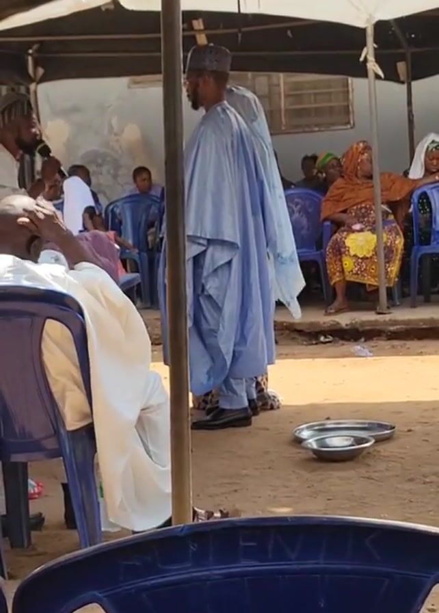 The video depicts an outdoor event, possibly a ceremony or gathering, taking place under a series of canopies. Several individuals are present, including men and women of varying ages. One man, dressed in a light blue robe and a dark cap, stands centrally. Another man approaches him with a microphone, presumably speaking to him. Other individuals are seated on blue plastic chairs. Some women are wearing colorful traditional clothing. There are metal trays placed on the ground nearby. The ground appears to be sandy. The overall setting suggests a cultural or community event.