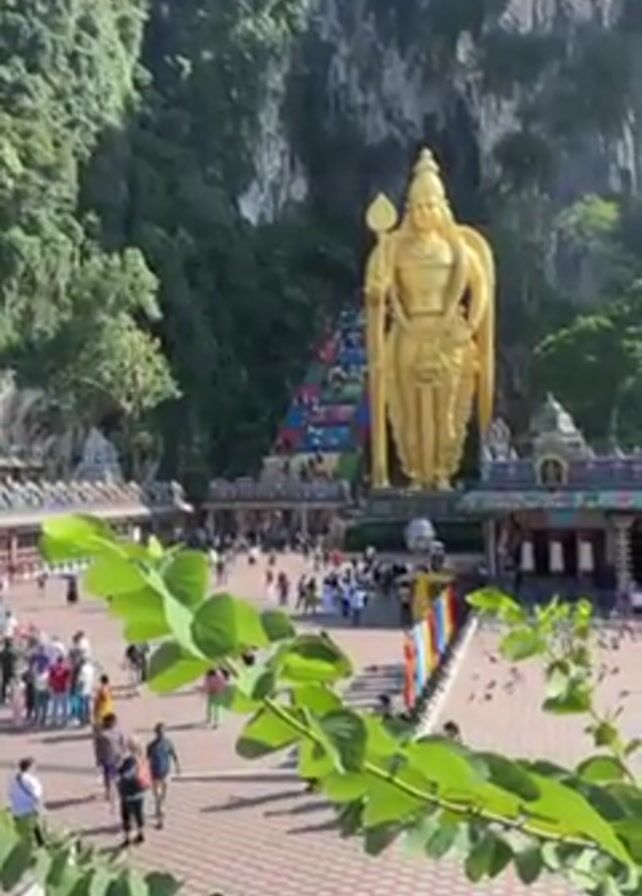 n outdoor view of the Batu Caves in Malaysia. A giant, golden statue stands prominently in the foreground. Behind the statue, colorful stairs lead up to the cave entrance in the hillside. Many people are walking in the plaza in front of the statue and on the stairs. Green foliage partially obscures the lower left corner of the frame. The weather appears sunny and bright.