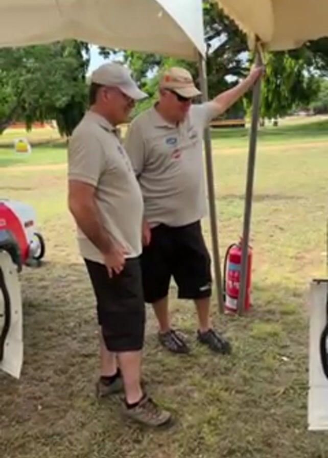 Two men stand under a white tent, near an open door of a white rally car. The man on the left wears a light beige shirt, dark shorts, and a beige baseball cap. He has his left hand in his pocket. The man on the right is slightly taller, wearing similar clothing but with a light tan hat. He has his right hand on the tent pole. To the right of the men is a red fire extinguisher. As the camera pans right, the interior of the car is visible, showing a roll cage and racing features. The car is adorned with decals and racing numbers. The background shows a grassy field with trees and a small gazebo in the distance.